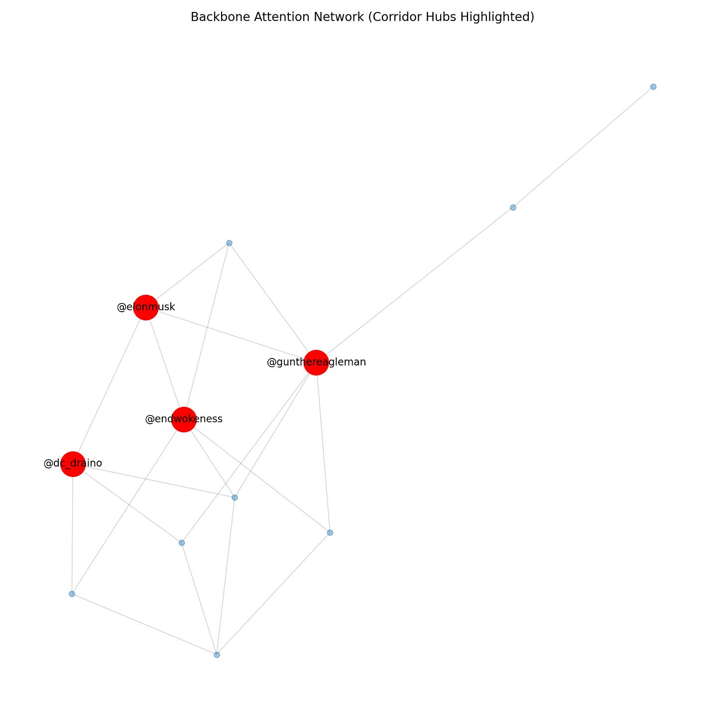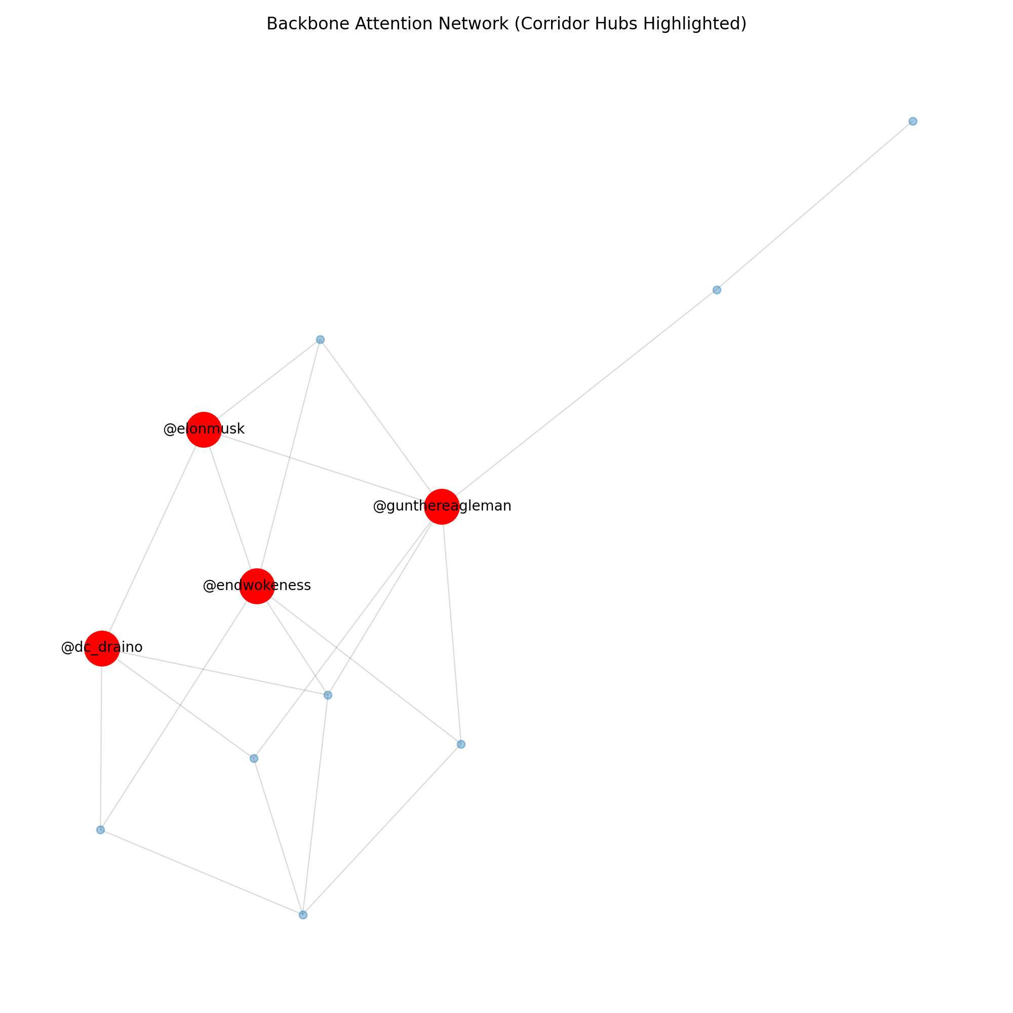 Virality is often described as chaotic—an emergent property of millions of individual decisions. But when we map how stories actually travel, a different pattern appears. In the extracted backbone of the network—42 nodes connected by 64 edges— attention does not flow evenly. It moves through repeatable corridors.