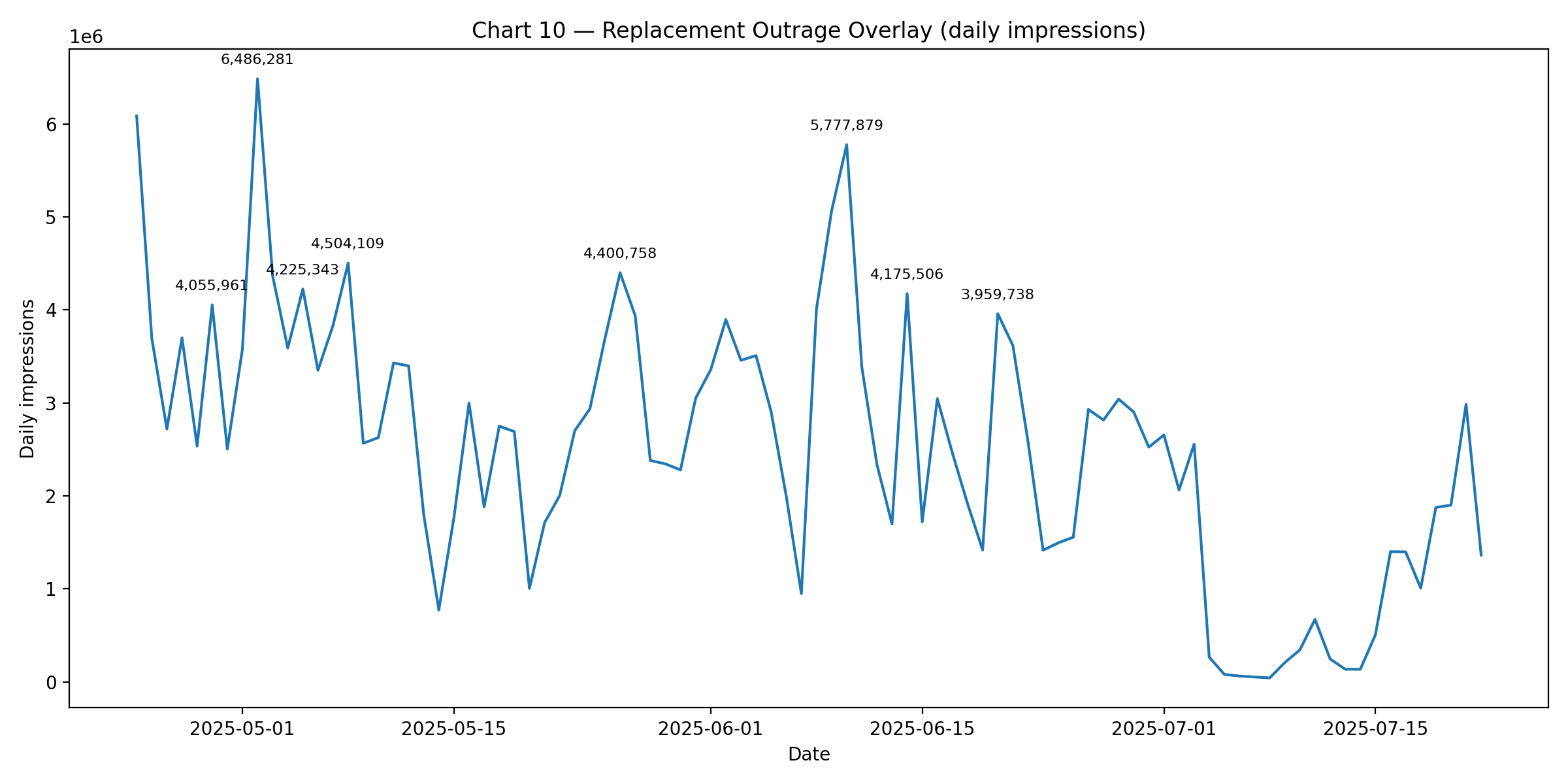 Our day-level analytics show a repeated and consistent pattern: sharp ascents to extraordinary visibility followed by rapid collapse. Peaks routinely reach millions of impressions in a single day, only to fall back to baseline before sustained pressure can accumulate. The curve is unmistakable—a narrow peak followed by steep decay, with no durable plateau in between.