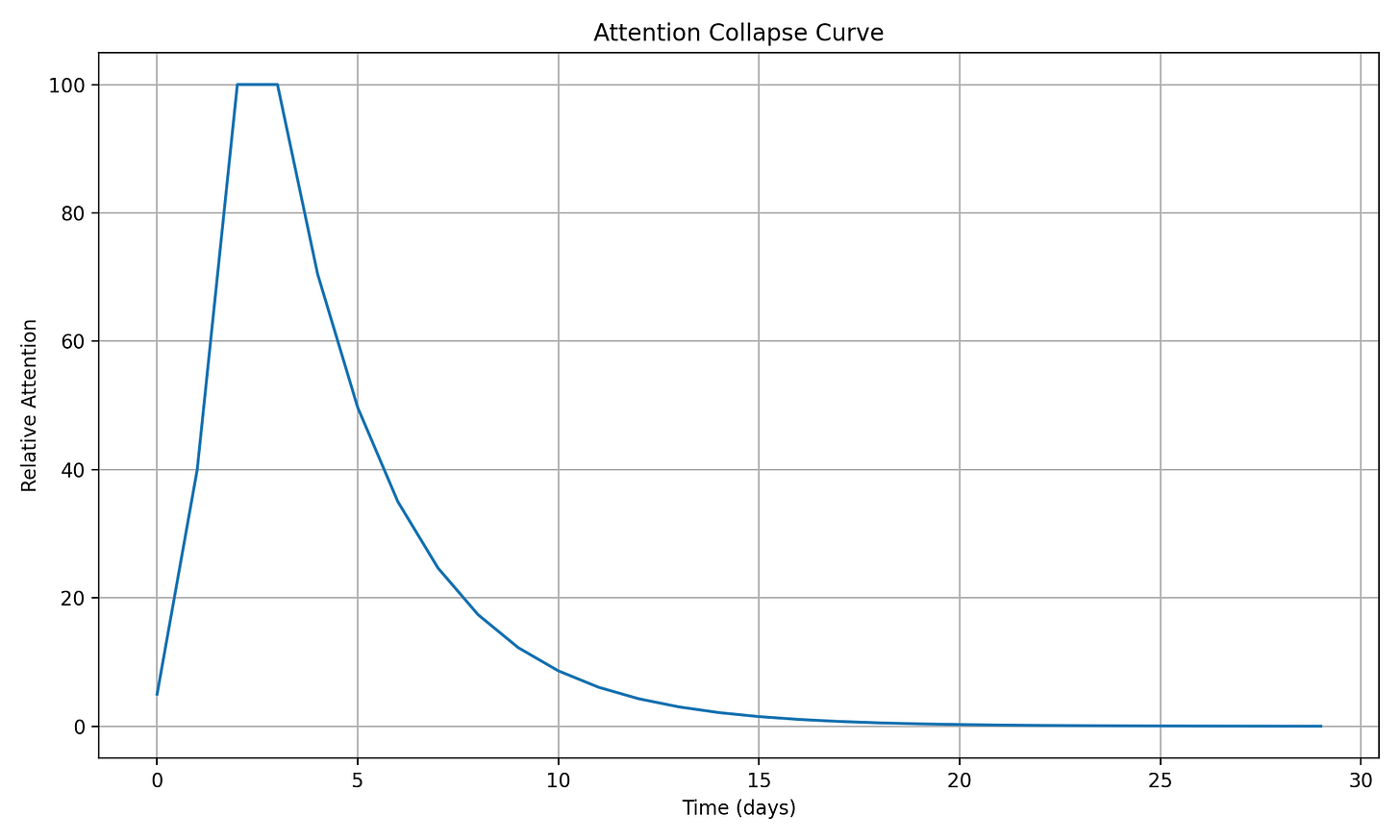 The story does not die because it is disproven. It dies because it cannot remain in view long enough to matter. Stories reach massive attention quickly, but collapse before pressure can build or consequences can form.