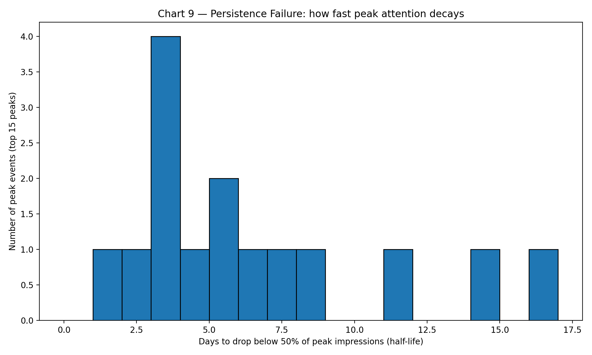 Our data shows this pattern with unusual clarity. Across multiple cases, the peak arrives quickly, often reaching millions of impressions in a single day, and then collapses before a plateau can form. The ranking system does not wait to see whether a story is resolved. It simply reallocates attention to whatever is moving faster next.