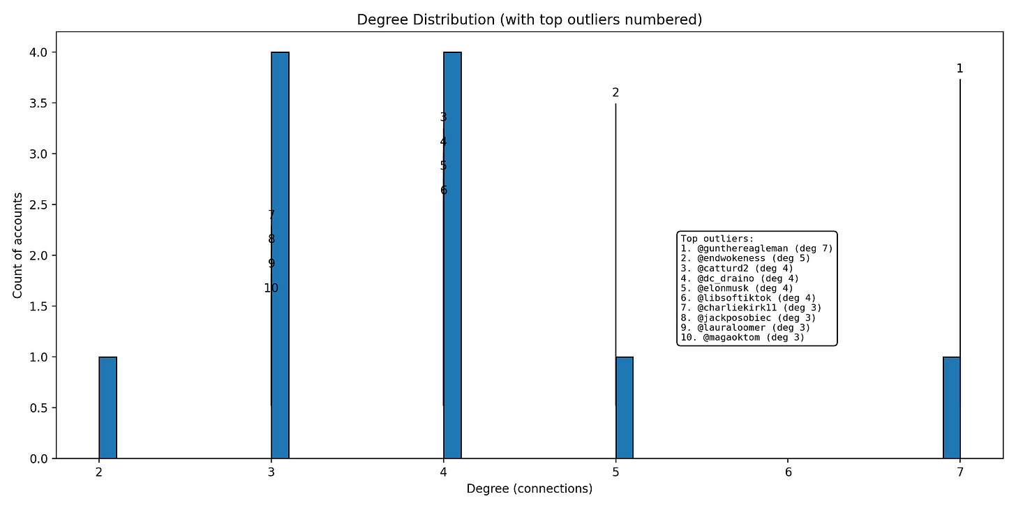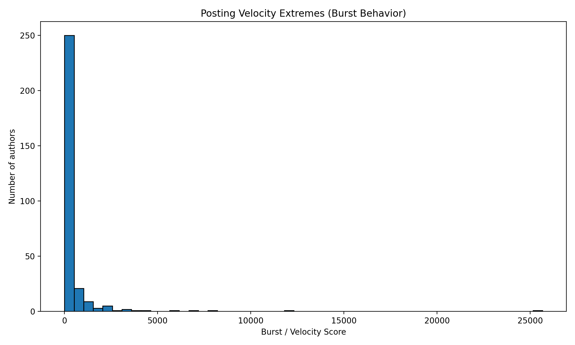 The maximum suspicion score reaches 70, and the same accounts that dominate the corridor analysis reappear as extreme statistical outliers. High degree. High connectivity. High recurrence across unrelated narratives.