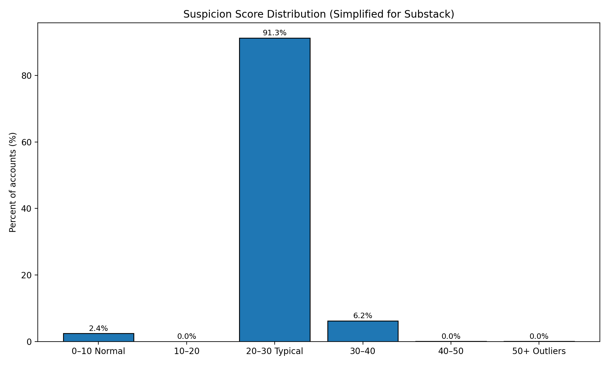 The suspicion model applied across 9,897 distinct handles produces a broad distribution with a clear center. Most accounts cluster near the median score—reflecting ordinary variation in activity and connectivity. A small number, however, fall far outside this range, forming a pronounced tail.
