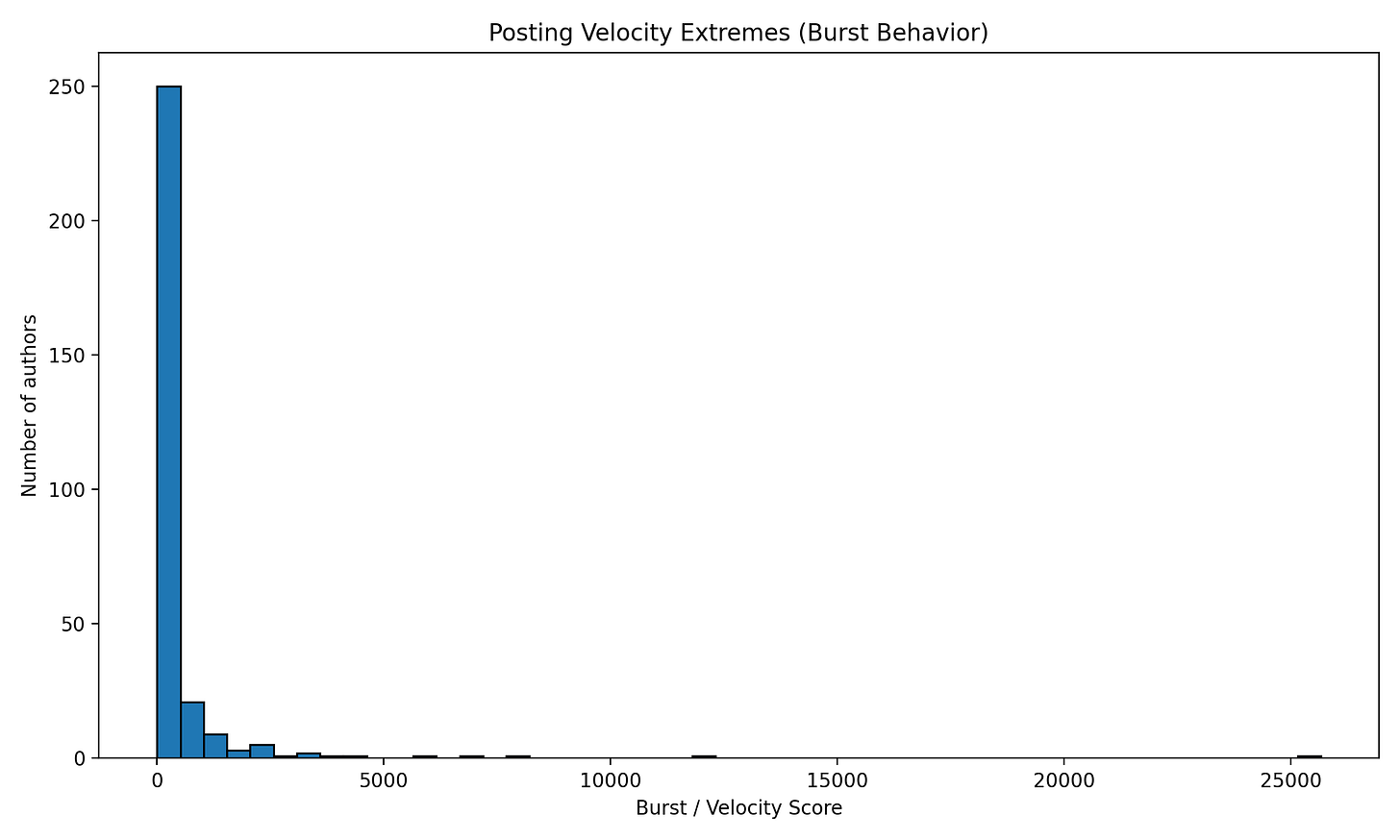 The Bayesian coordination ledger reinforces this pattern. Across 243,891 recorded events, posting activity reflects sustained participation rather than absence. People did not scroll past these stories as if they were invisible; they engaged, amplified, and followed the material at levels consistent with high-interest investigative content.