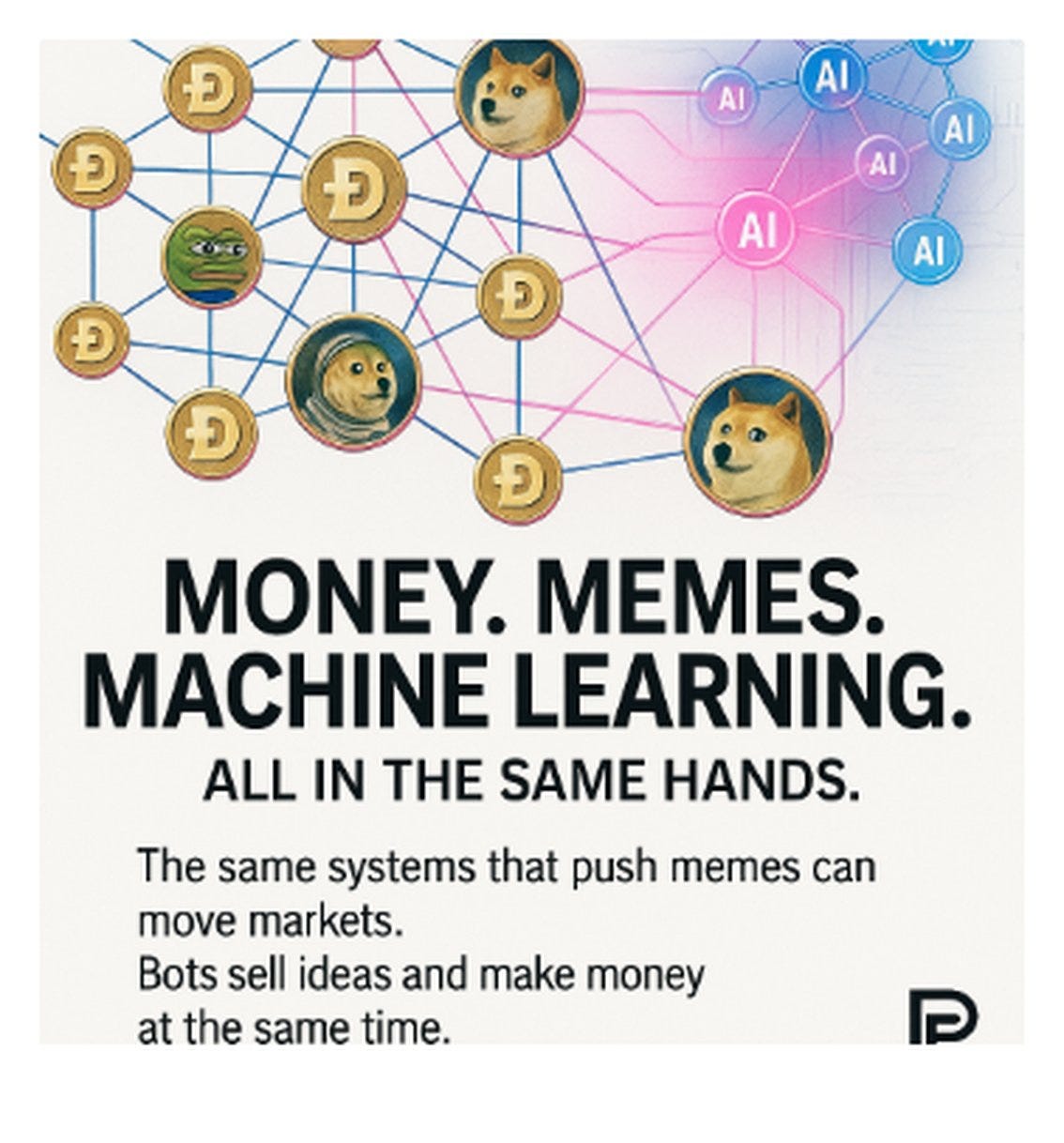 DOGE/AI Containment Grids Money. Memes. Machine learning. All in the same hands. The same AI systems that control what memes go viral are also being used to move money and markets: - Bots flood social media with jokes, memes, and “hot tips” to make something feel popular. - Once you click, share, or buy-in, algorithms capture your behavior and feed it back into the system. - Crypto tokens like DOGE and meme stocks are pumped and dumped using these networks. It’s not random hype — it’s engineered influence: The same pipelines that make you laugh at a meme are often the ones deciding where billions flow.