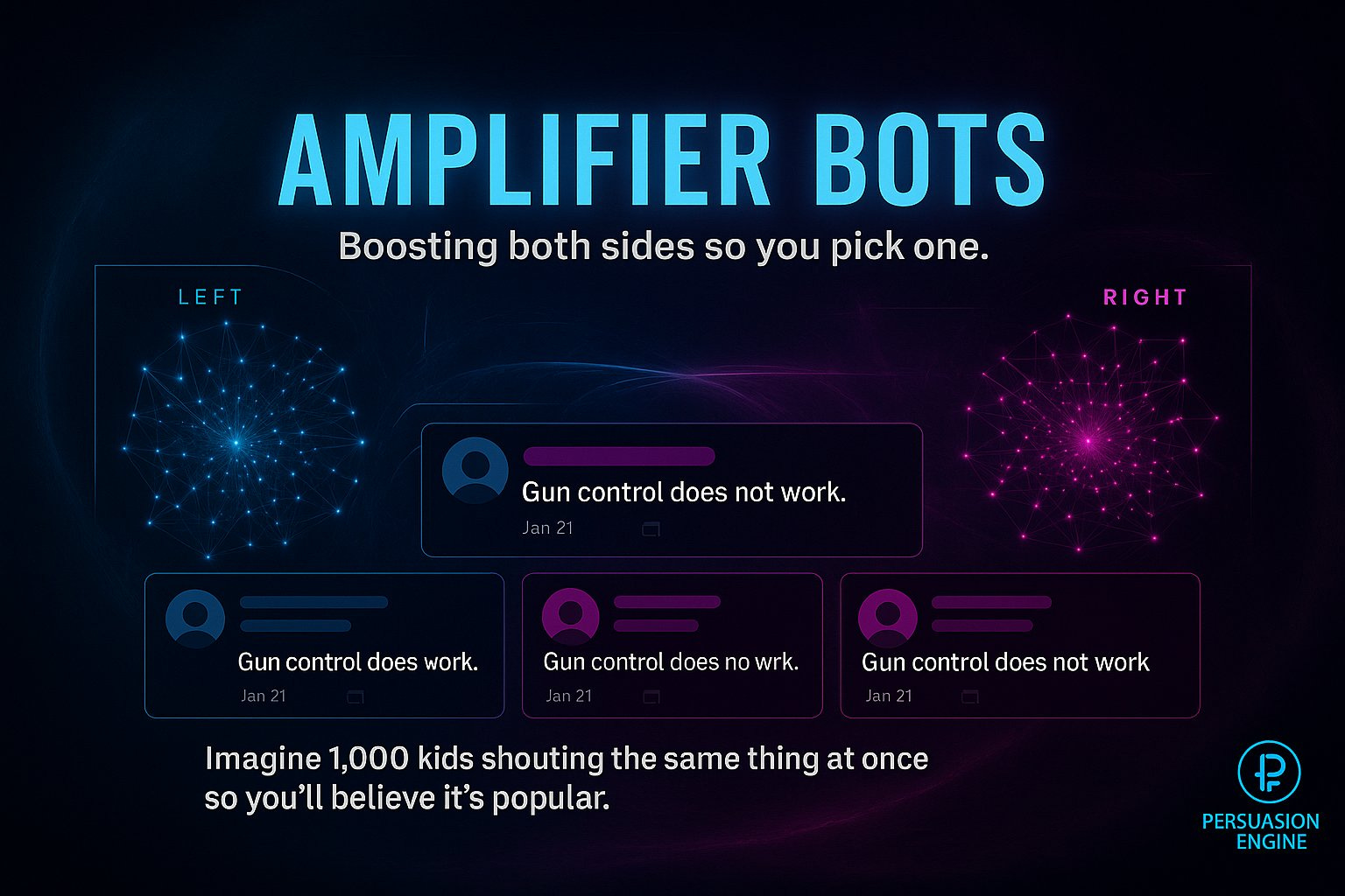 AMPLIFIER BOTS Boosting both sides to make sure you pick one. Purpose: Inflate reach for influencers, hashtags, and narratives. Imagine 1,000 kids shouting the same thing at once so you’ll believe it’s popular.