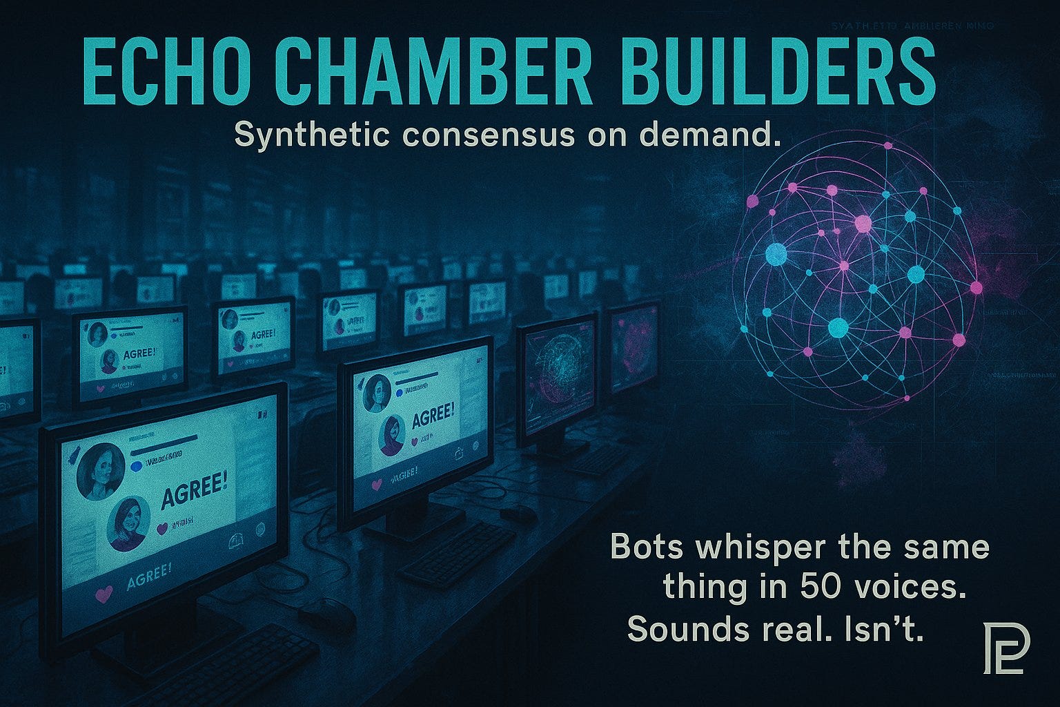 ECHO CHAMBER BUILDERS Synthetic consensus on demand. Purpose: Fake the feeling that “everyone agrees.” Bots whisper the same thing in 50 voices. Sounds real. Isn’t.