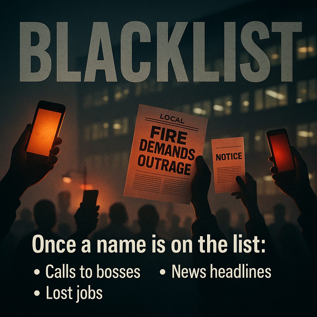 Once a name appears on a public/private blacklist the chain reaction is brutal: coordinated calls to employers and licensing boards, social-media pile-ons, local news pickups — and quick job suspensions or firings. For many, a tweet becomes a real-life crisis overnight.