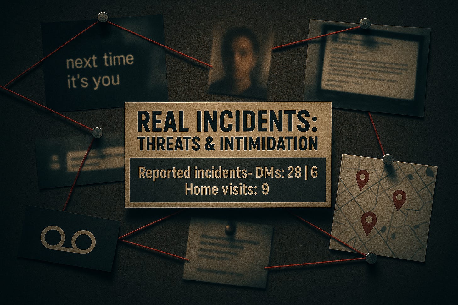 Evidence: threatening DMs, anonymous calls to workplaces, reports of people afraid to leave home. Even without attacks, fear, counseling needs, and security costs followed. Harassment → tangible harm. This is what we found on just a brief sweep.