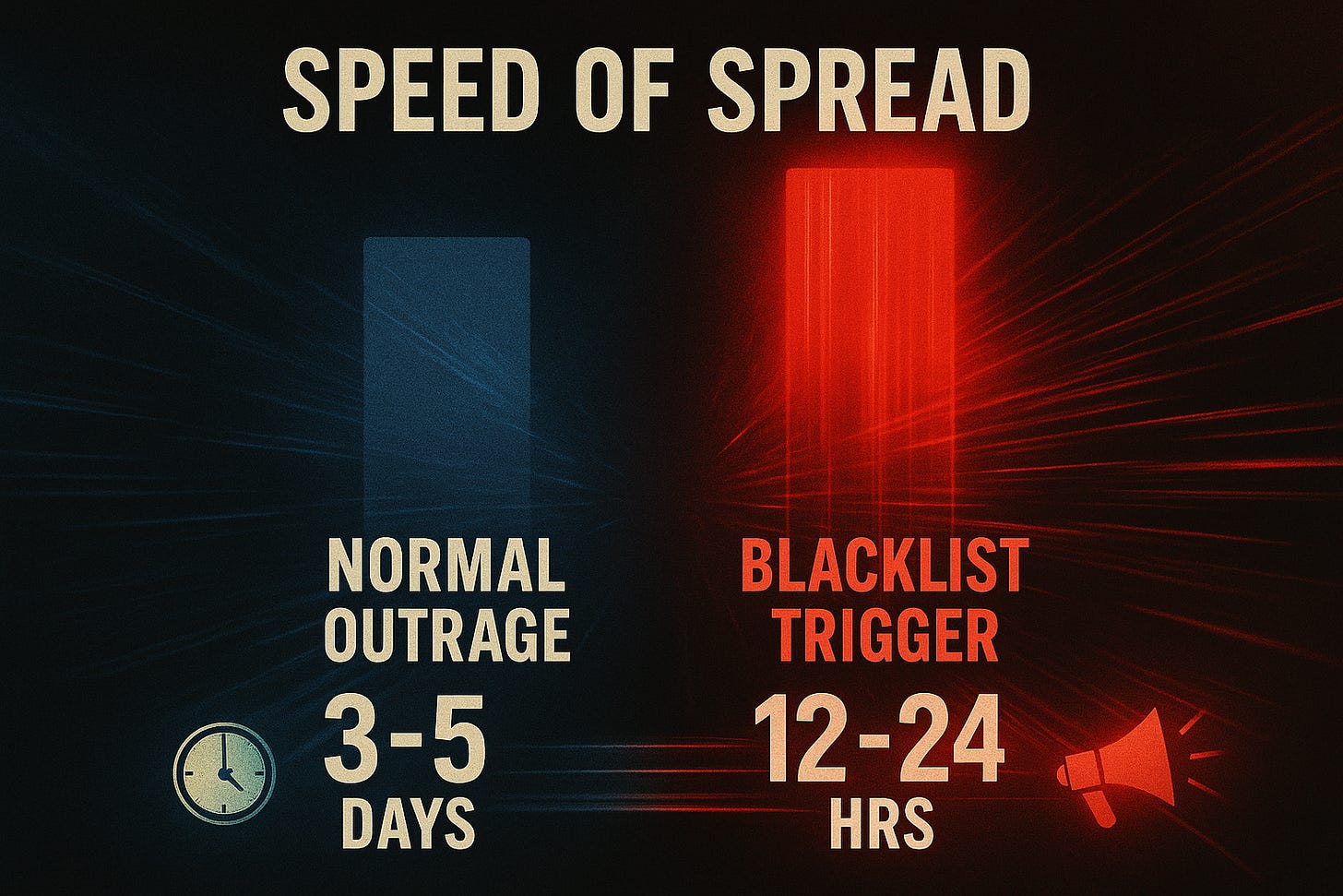 Traditional outrage cascades over 3–5 days; the blacklist-trigger in this case accelerated that to 12–24 hours. Rapid bot amplification + large amplifier accounts compressed time, giving little space for context, correction, or calm response.