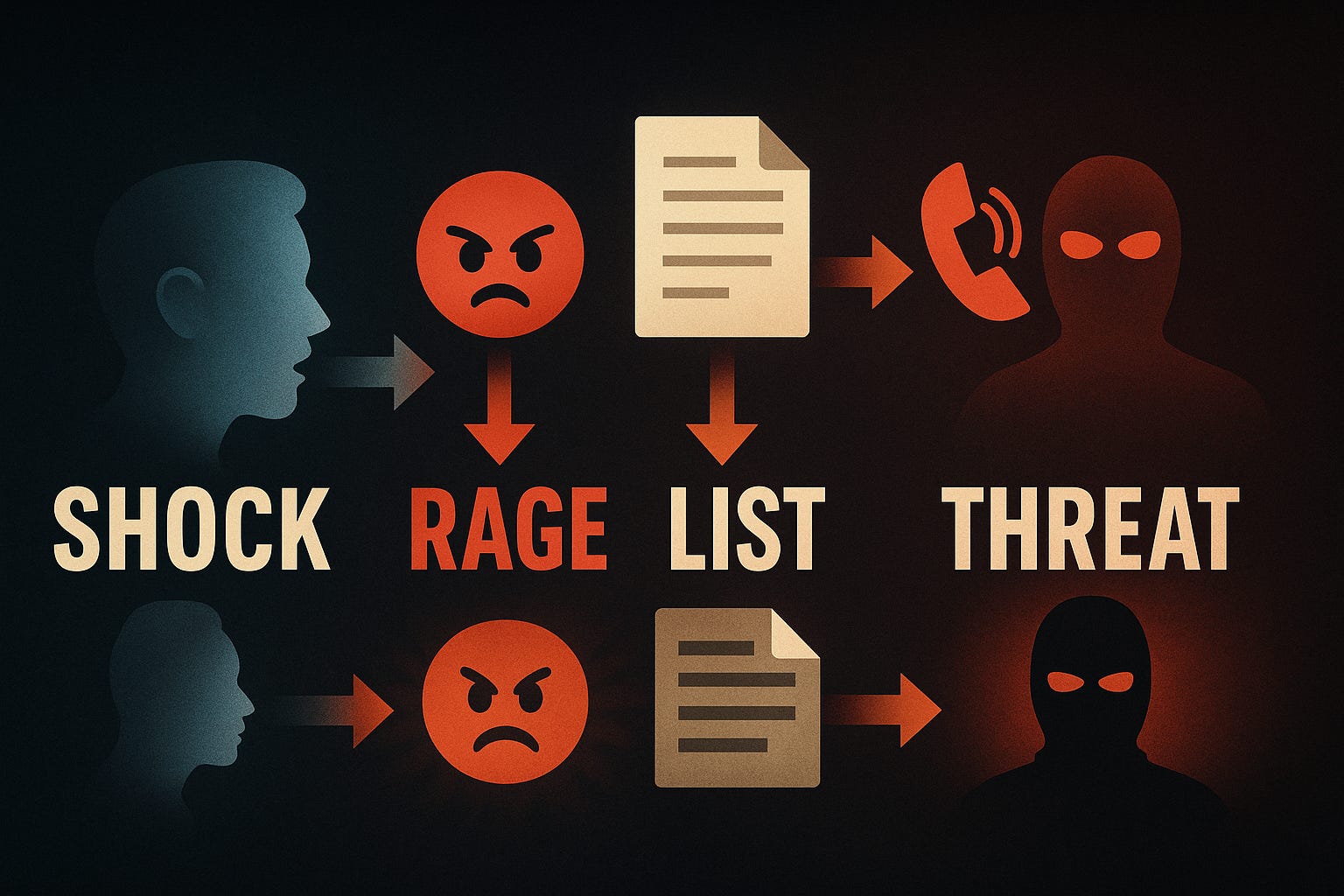 The Trigger Effect is psychological: shock → rage → list → cancel. Bots + validation normalize it until some cross into threats and violence. That’s how outrage snowballs into intimidation.
