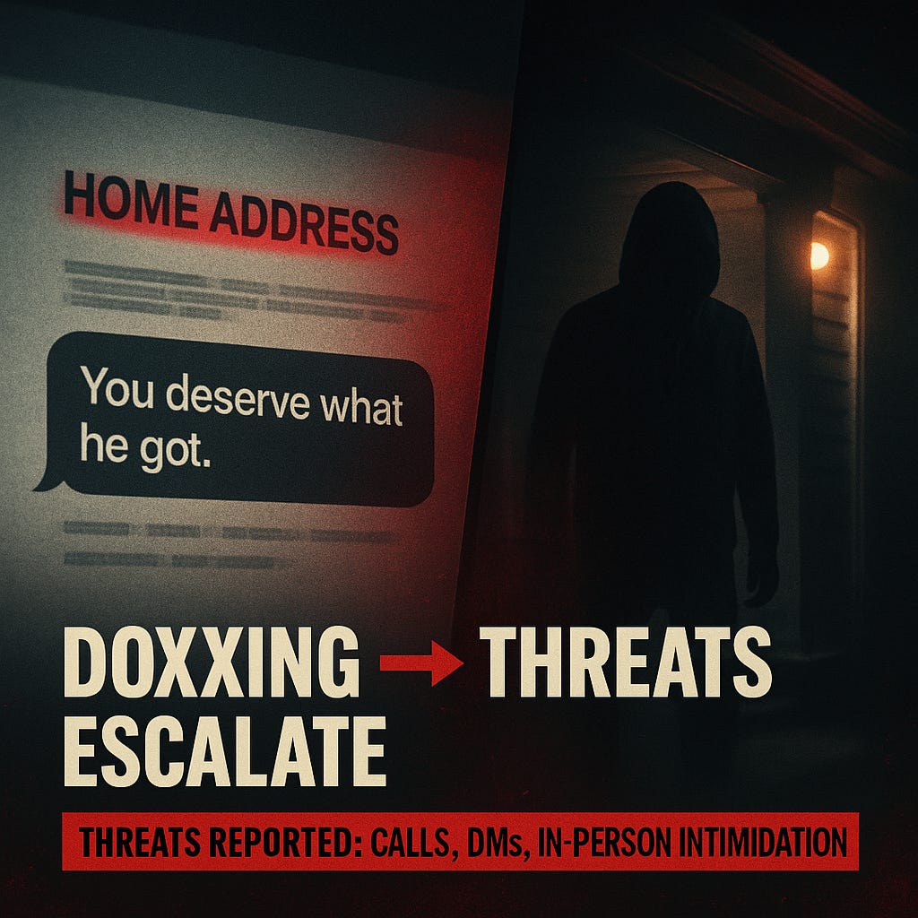 Doxxing moved the harassment offline: leaked location details, workplace names, and home proxies appeared in public threads and docs. Within hours, messages emerged that crossed from taunting to threats — explicit death threats, “we know where you live,” and calls for violence. Multiple targets reported threatening DMs, calls, and intimidating at-home encounters. This escalation is the most dangerous slice of the Trigger Effect.